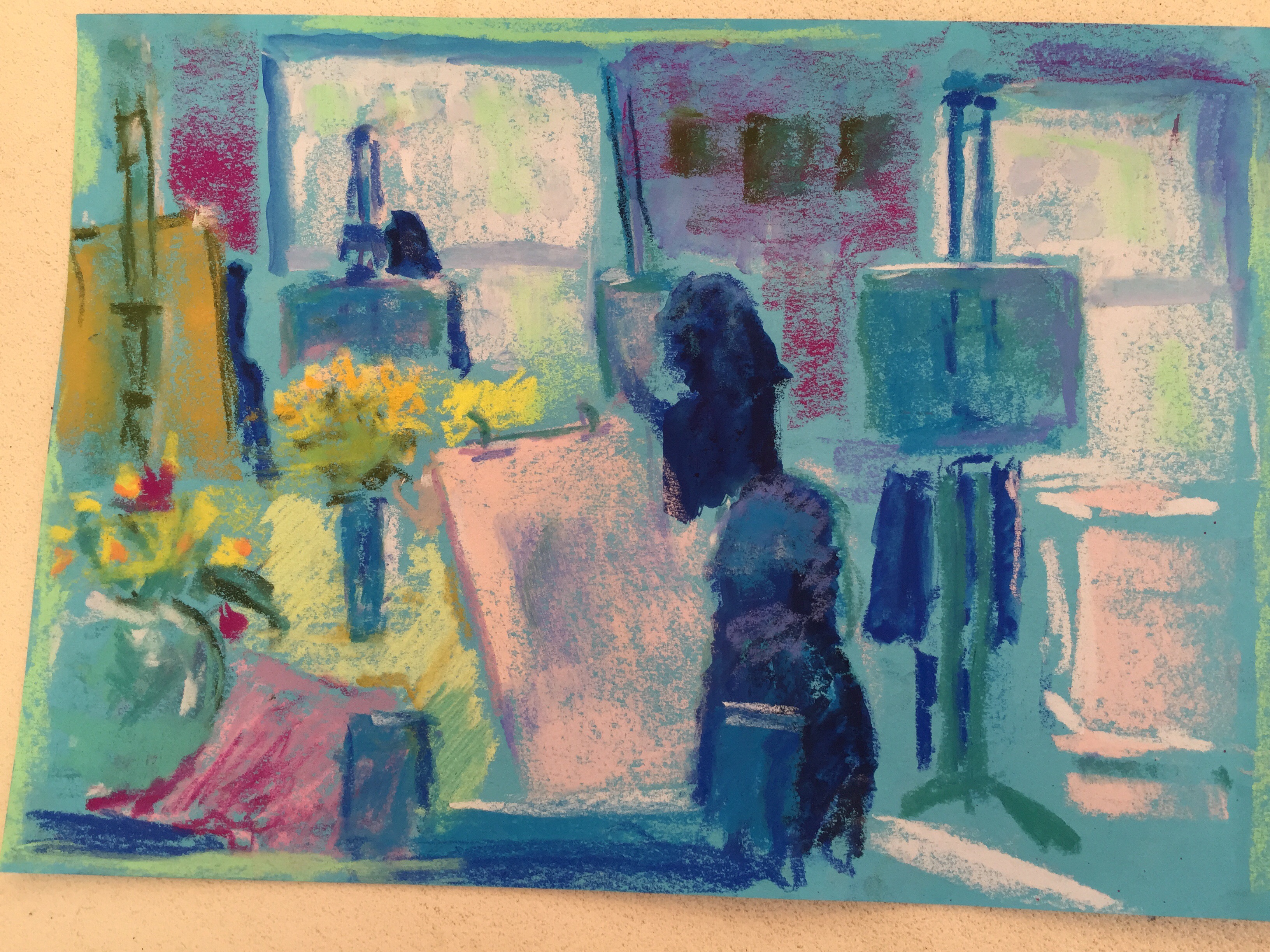 I have been reading a plethora of texts, some say to fathom, others less so. All in all, it’s getting a bit intellectual at Pollie Towers, just the way we like it. Anyway, as a bit of light relief I went to an open drawing and painting class at the school where I do my Life classes. I decided to have a sketch using my pastels. Did I mention them ever? Rembrandt pastels bought for a song on eBay because the box was mashed. Transplanted to an empty Woden pencil box and they are perfect for schlepping around with. Anyway, here’s the finished main sketch …the art room