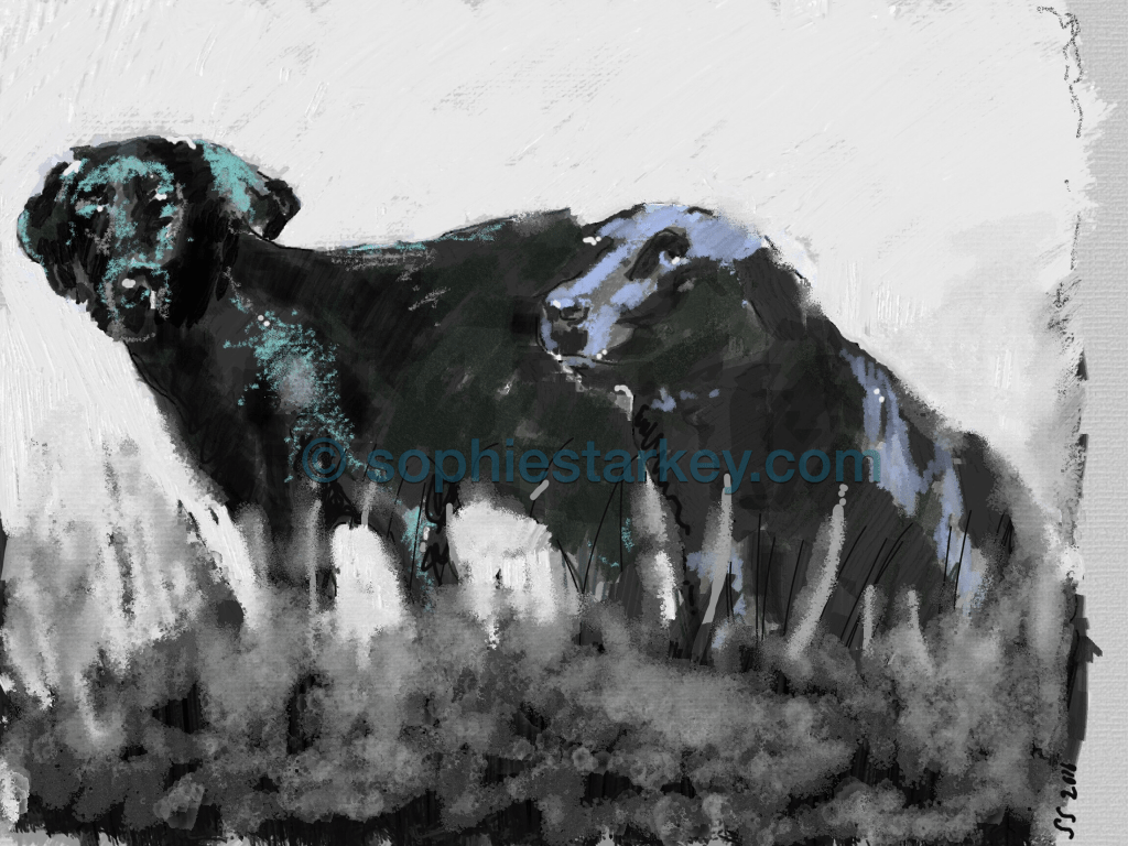 A friend recently very generously gave us tickets to the races at Cheltenham. No, I didn’t win any massive amounts sadly but we had a lovely day. As a thank you I did a portrait of his much loved dogs. All digital, the picture is then printed onto water colour paper for added texture. He was pleased with it I’m happy to say.